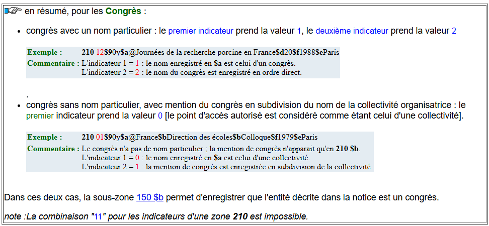 Il est important de sélectionner les bons indicateurs. C’est la même zone Unimarc pour les collectivités et les congrès, c’est donc la valeur sélectionnée comme premier indicateur qui permet le mapping avec le Marc21.