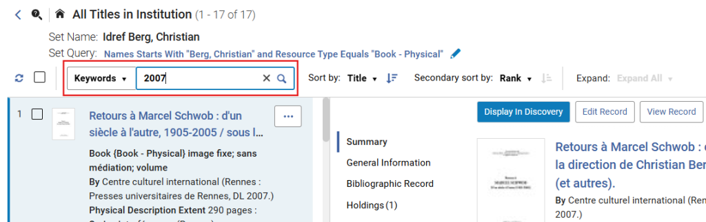 Lorsqu’on ouvre le contenu du set, seules les notices correspondant au critère de recherche sont visibles.