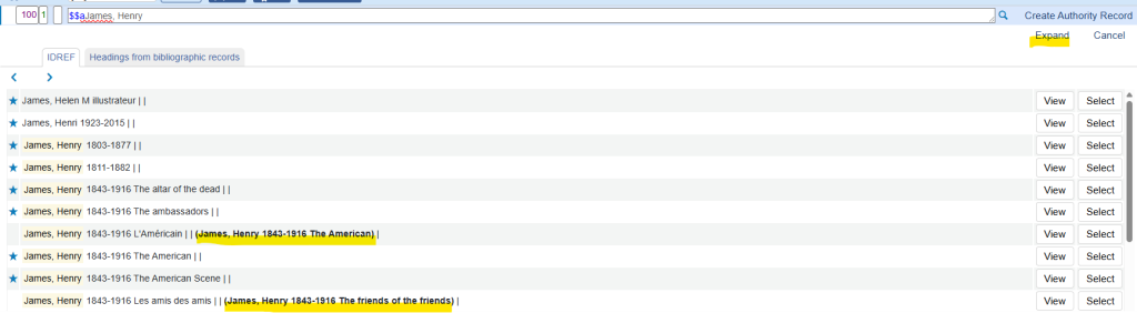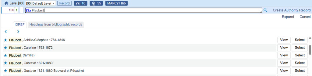 Le bouton Expand permet d’afficher la forme préférée, en gras à la suite d’une forme non préférée, afin de faciliter l’identification. Si la forme préférée ne contient pas de sous-champ $$d (dates), le contenu du 046 ($$f et $$g) peut également être affiché.