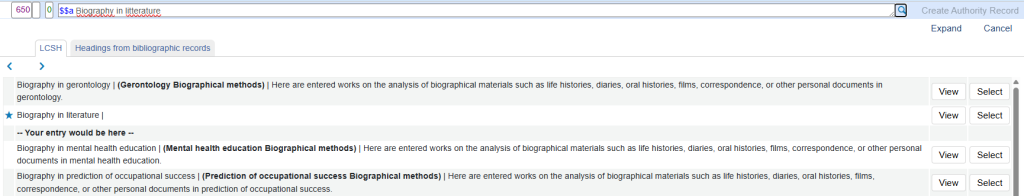 Le bouton Select permet de sélectionner la vedette et de la lier au point d’accès dans la notice bibliographique.