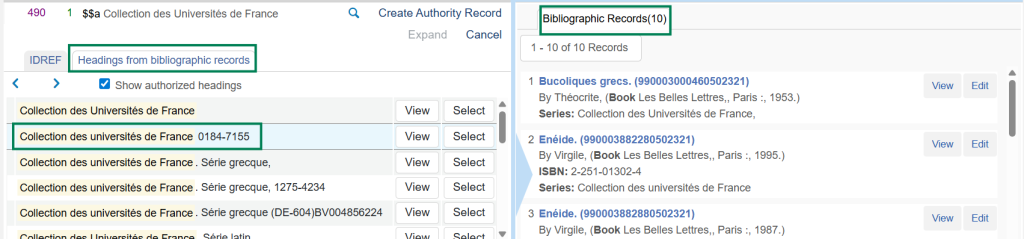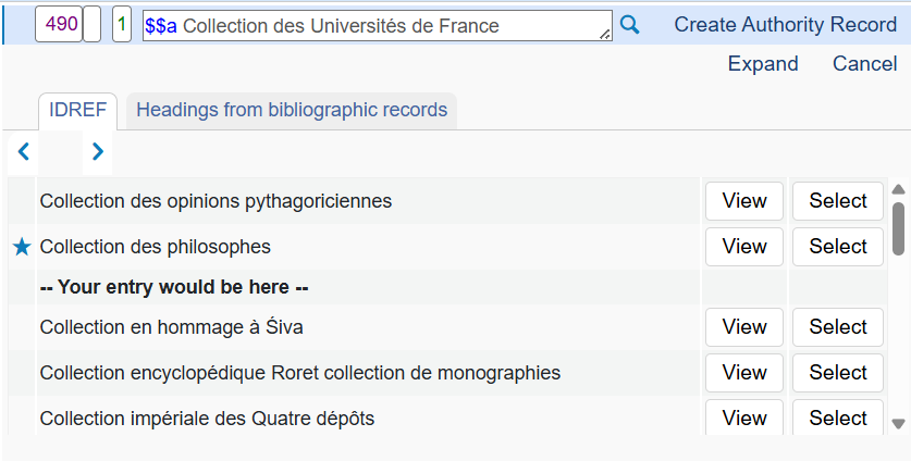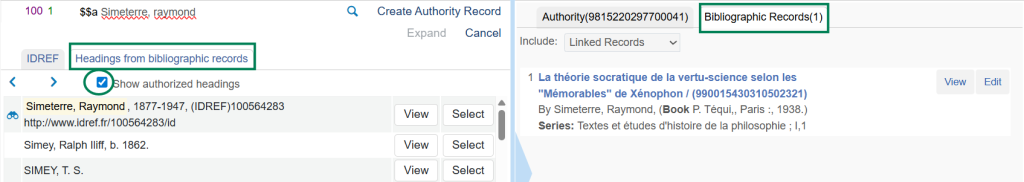 Le bouton View permet d’afficher la notice d’autorité en regard de la liste d’entrées.