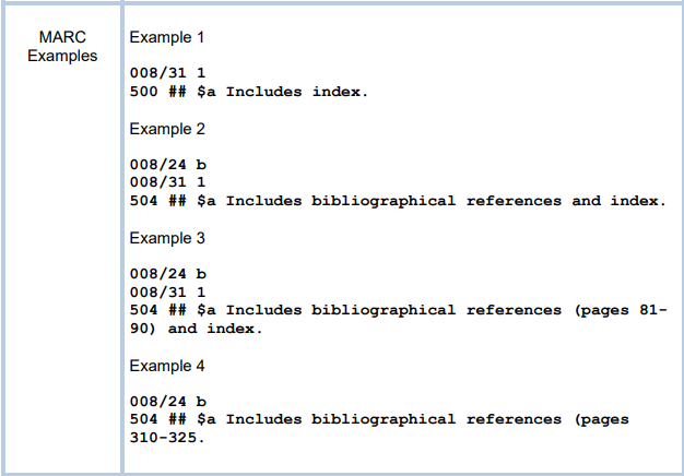 Lorsque le contenu supplémentaire est constitué à la fois d’une bibliographie et d’un index, il faut utiliser la zone 504.